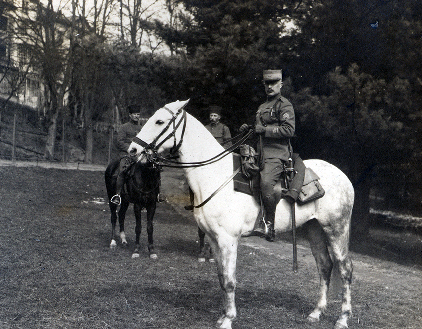 Item is a photograph of an Commandant Reviers, in uniform, on horseback in Langenschwalbach, Germany. Katharine McLennan, photographer, captured many images of servicemen that she encountered during her time as a WWI nursing volunteer.