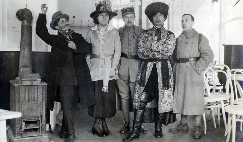 Item is a photograph of a group of men dressed in costume for a theatre production at a hospital in Langenschwalbach, Germany. These productions were used as a means of keeping spirits high in hospital settings that were filled with disease and death.