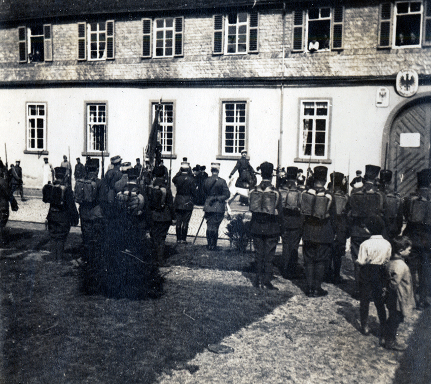 Item is a photograph of unidentified servicemen in uniform in Langenschwalbach, Germany. Katharine McLennan, photographer, captured many images of servicemen that she encountered during her time as a WWI nursing volunteer.