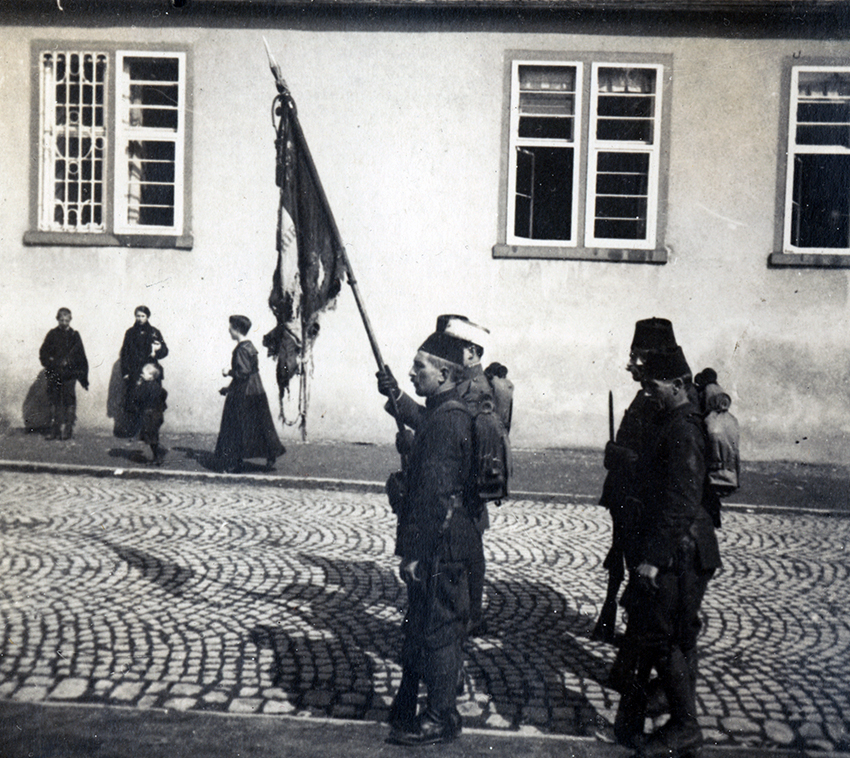 Item is a photograph of unidentified Tiraillieurs in uniform in Langenschwalbach, Germany. Katharine McLennan, photographer, captured many images of servicemen that she encountered during her time as a WWI nursing volunteer.