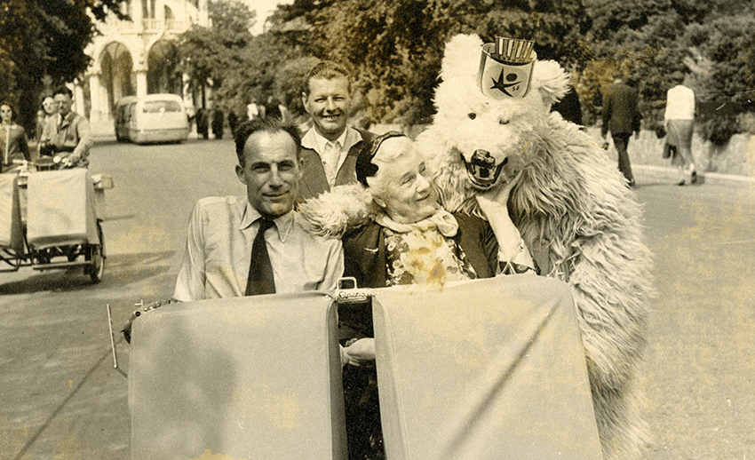 Item is a photograph of Margaret (McLennan) Kendall at the Brussels Exhibition, 1 June, 1950. In the image, Margaret is sitting in a cart and being hugged by a person in a bear costume. Below the photograph is inscribed "This is the afternoon when I walked into the fountain to everyone's consternation. A pool set in the floor that I simply did not see. M.K."