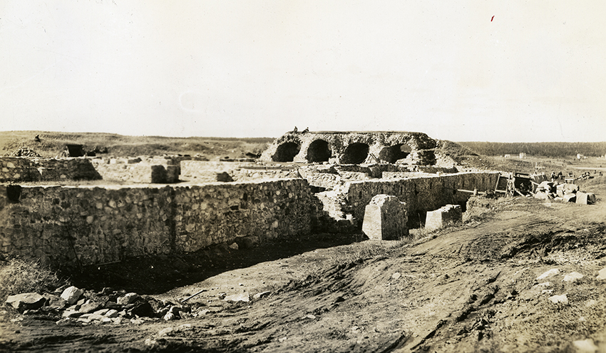 Item is a photograph of the foundations of several buildings at the Fortress of Louisbourg National Historic Park, as well as the casements that were a part of the King's Bastion. This is how the site would have appeared to J.S. and Katharine McLennan as they first arrived in Louisbourg. In the early years, people were free to take away any artifacts they found at the site. Katharine and her father spent much of their time tracking down lost artifacts. After the site received National Historical Site recognition, people were no longer allowed to take "souvenirs" from the site.