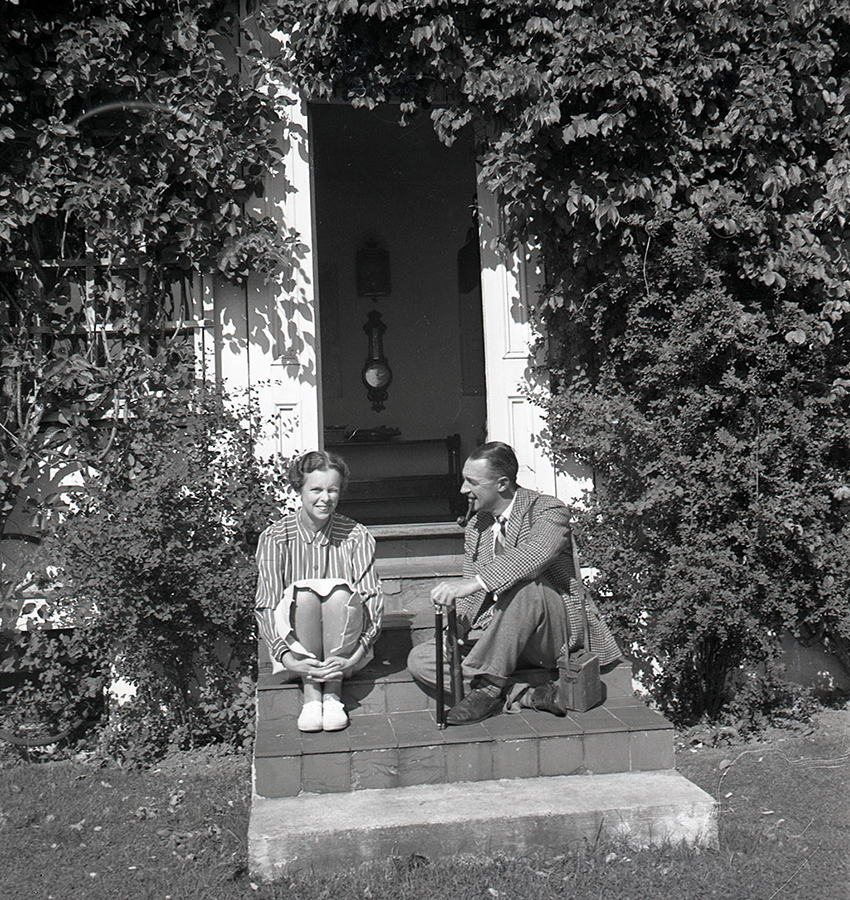Scope and Content: Item is a photograph of two unidentified people sitting outdoors on the steps of Petersfield.