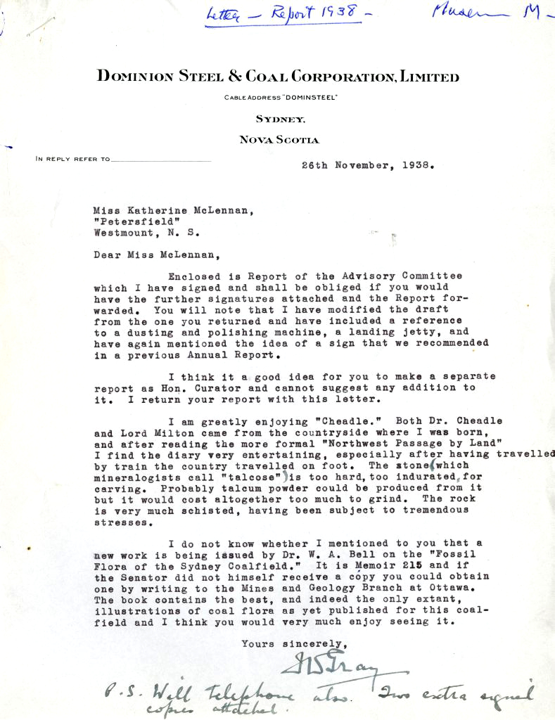 Item is a letter from J.W. Gray to Katharine McLennan which accompanied a copy of the Report of the Advisory Committee for the Fortress of Louisbourg site that she was requested to sign. Also discussed in the letter is the work of Dr. W.A. Bell regarding the "Fossil Flora of the Sydney Coalfield." The attached report provides suggestions for the improvement of the Fortress of Louisbourg National Historical Park, including the addition of receptacles for letters, the construction of a new gate, and fixing the leak on the southern wall of the Museum.