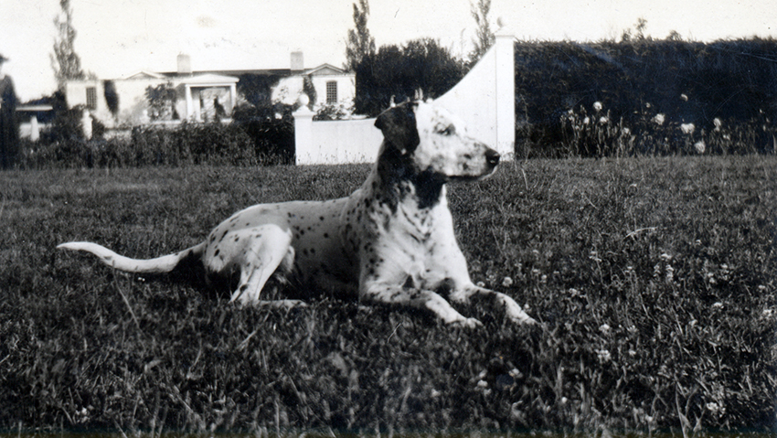 Item is a photograph of Kim the dog on the grounds of Petersfield, taken by Katharine McLennan.