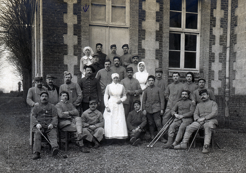 Item is a photograph of staff and patients at the Hôpital Auxiliaire in Pont-Audemer, France taken in March, 1917. Katharine McLennan, Edith Parkman, and Helen Homans were identified in the photograph.