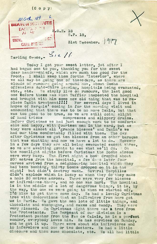Item is a letter from Katharine McLennan to Grace McLennan, dated 31 December 1917. Katharine writes about what events took place during the time around the Christmas and New Year holidays at the H.O.E. 18. She also mentions some of the staff at the hospital, and the duties that she and they must perform during their shifts.