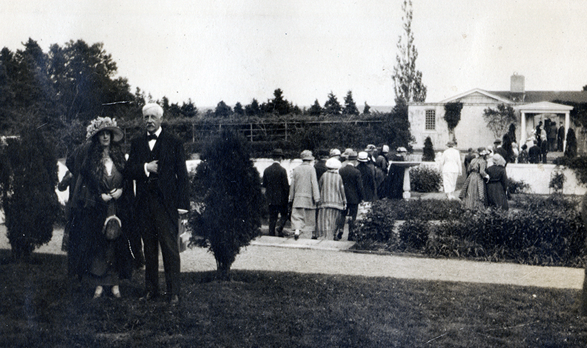 Item is a photograph of Lady Byng and J.S. McLennan posing outside of Petersfield. The estate welcomed many well-known visitors in its time, including Lord and Lady Byng, the Baden-Powells, and a number of Canadian and British political figures.