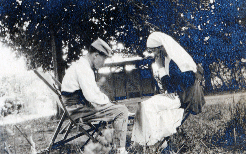 Item is a photograph of Katharine McLennan playing checkers with patient Laborde.