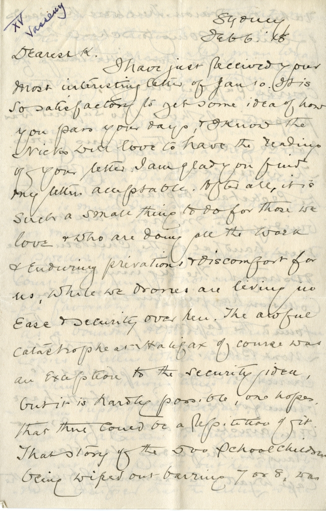 Item is a letter from F.C. Kimber sent to Katharine McLennan during her time serving with the Red Cross during World War I. The letter focuses on an assortment of topics including the aftermath of the Halifax Explosion and the results of its inquiry, a new minister at Christ Church, and the production of scotch at the Sydney Steel coke ovens.