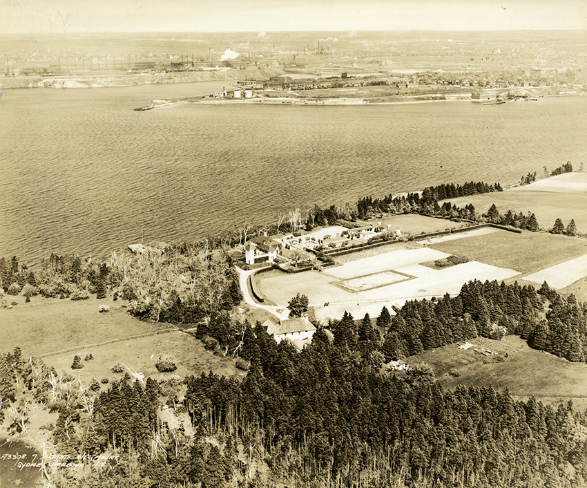 Item is a photograph of the Petersfield estate taken from the air. The Sydney Steel Plant and part of Sydney Harbour are visible in the background.