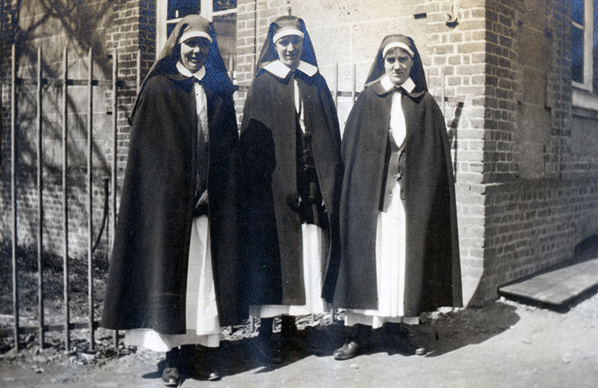 Item is a photograph of Edith Parkman, Helen Homans, and Katharine McLennan in uniform during their time spent volunteering as nurses during WWI. Katharine spent a great deal of time with these two women, working with them at different hospitals and traveling the French countryside with them while they were off duty.