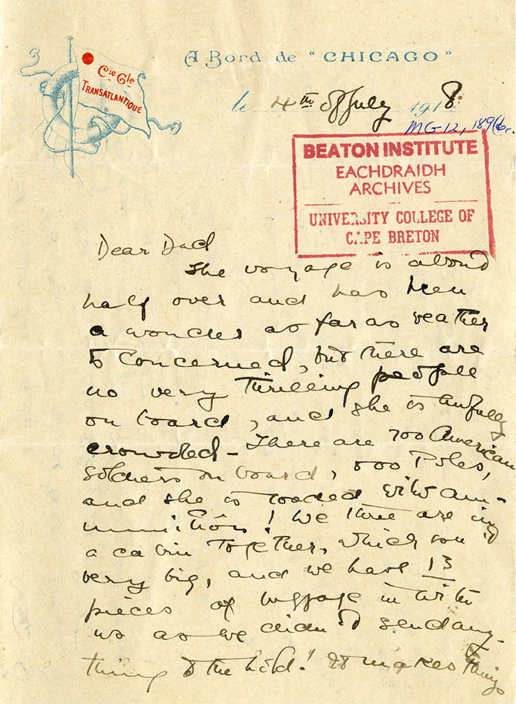 Item is a letter from Katharine McLennan to her father, J.S. McLennan, dated 4 July 1918. The letter, which Katharine wrote during her voyage back to France on the steamer Chicago, features a timeline of the events that took place up to Katharine's departure. This included trips to Boston and New York and meeting with friends and family, including Isabel (McLennan) Farley and Grace McLennan.