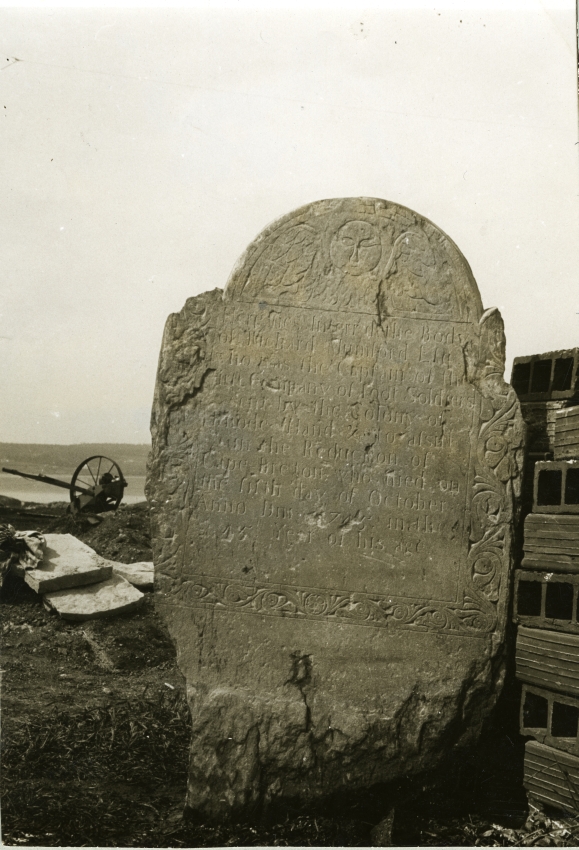 Item is a photograph of the tombstone of Richard Mumford. The tombstone was found in the hospital in 1939.