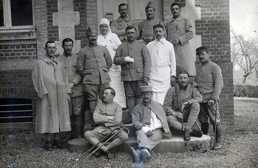 Item is a photograph of a group of sergeants posing in front of hospital doors with nurse Mme. Bourdon. Katharine McLennan, photographer, took many group photographs like this one during her time volunteering at military hospitals during WWI.