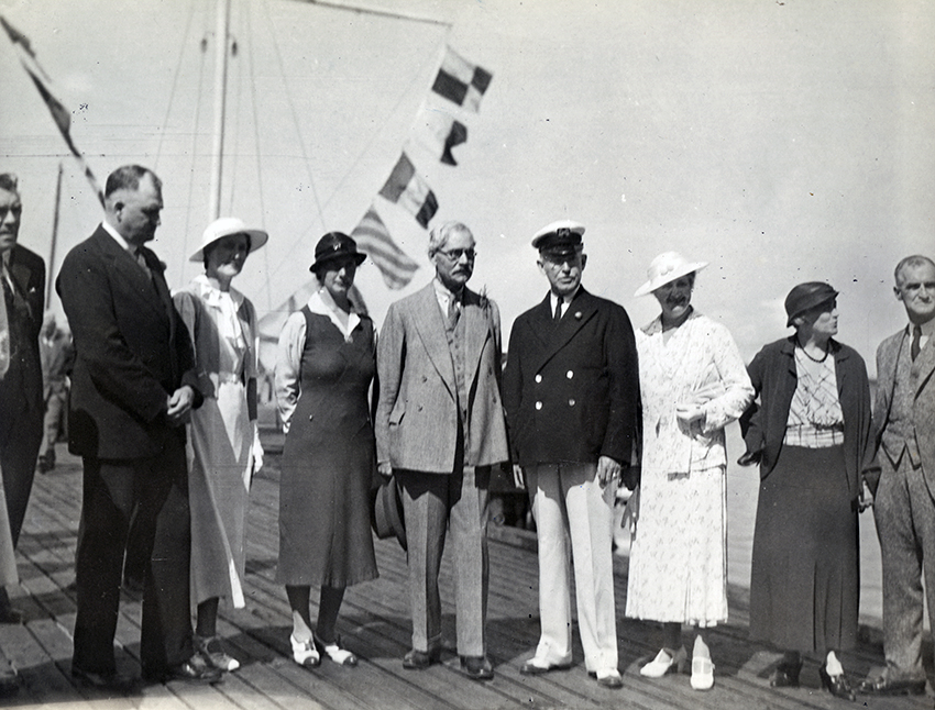 Item is a photograph of British Prime Minister Ramsay MacDonald and guests posing on the dock at the Sydney Yacht Club during his stay at Petersfield from July 3 to 8, 1934. Featured from left to right are Col. Johnnie MacDonald and Mrs. MacDonald, Ishbel MacDonald, Prime Minister Ramsay MacDonald, Commodore H.J. Kelly, Mrs. James Bruce and Dr. James Bruce.