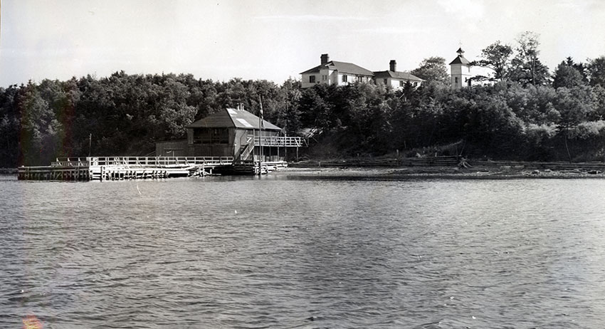 Item is a photograph of the Petersfield estate that was taken from the water. The photograph shows the home, some surrounding woodlands, and the boathouse. Petersfield was a prominent feature along the Harbour until its demolition, the last building having been torn down in 1959.