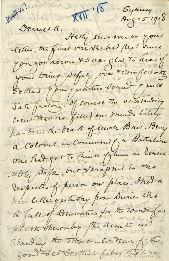 Item is a letter from F.C. Kimber sent to Katharine McLennan during her time serving with the Red Cross during World War I. The letter focuses on an assortment of topics including Sydney being full of soldiers and sailors, U-Boat activity along the Nova Scotian and American coastline, and F.C.'s brother receiving a membership to the British Empire Order. In addition, Kimber briefly discusses workers at the Sydney Steel Plant wanting to take a day off each week.