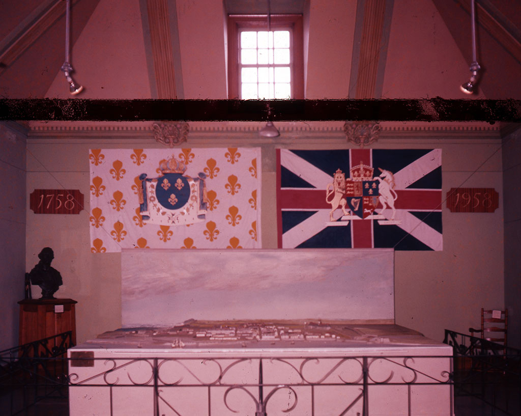 Item is a photograph of the interior of the Louisbourg Museum. The model is on display.