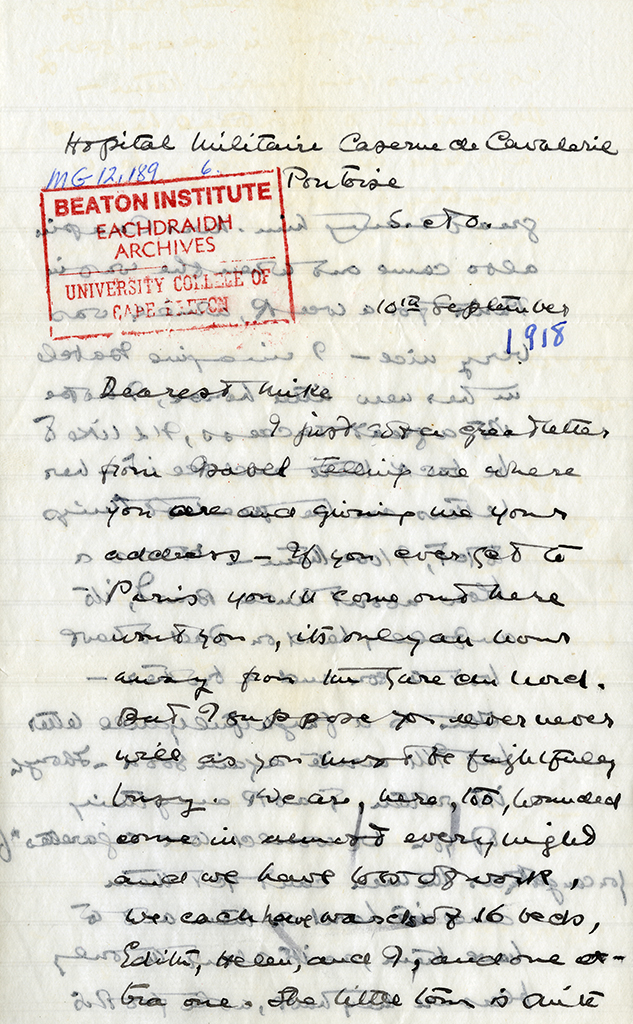 Item is a letter from Katharine McLennan to Mike Farley, dated 10 September 1918. In the letter, Katharine asks Mike to come and visit her if he is able, and describes the hospital space and staff at Pontoise. She also mentions the death of her uncle Bartlett.