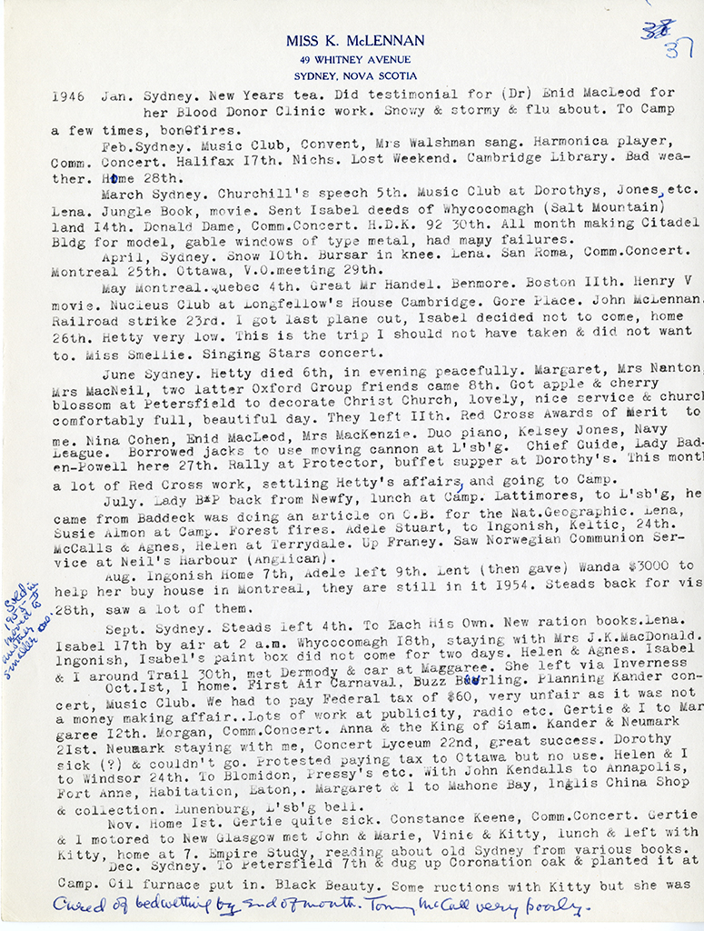 Item is a typed partial-transcription of Katharine McLennan's diaries from 1909-1952. Entries focus on important moments in Katharine's life, including her time spent in Europe as a girl and young adult, her trip west by car in 1927, and her work for both the Red Cross blood donor clinic and the Louisbourg Museum. The diary entries demonstrate how full and active her life was, and how involved she was in her community projects. The original copies of the diaries were burned by Katharine after she made these transcriptions.