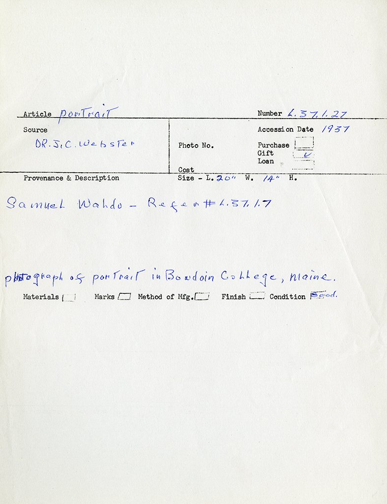 Item is an accession report for a photographic reproduction of a painted portrait of Samuel Waldo that was donated to the Louisbourg Museum by Dr. J.C. Webster. The report was written by Katharine McLennan. J.C. Webster was a museologist who fought for the preservation of historic sites of national importance, such as the Fortress of Louisbourg, and pushed for the construction of the Louisbourg Museum. Dr. Webster donated many items to the Museum's collection.