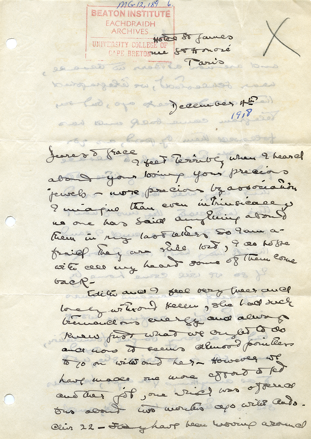 Item is a letter from Katharine McLennan to Grace McLennan, dated 4 December 1918. In the letter, Katharine describes the loss that she and Edith Parkman have been feeling since the death of their friend, Helen Homans. Katharine and Edith, now without work, were in Paris at the time looking for positions, and Katharine describes what the capital was like at the end of the war.
