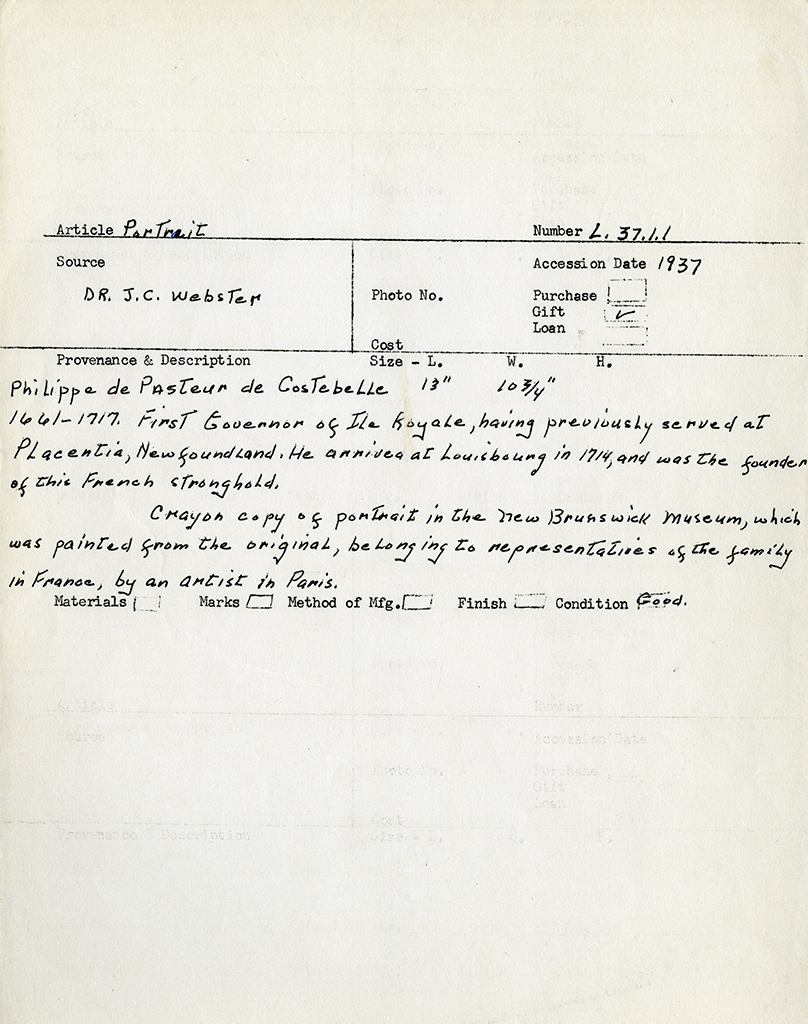 Item is an accession report for a crayon copy of a painted portrait of Phillippe de Pasteur de Costebelle that was donated to the Louisbourg Museum by Dr. J.C. Webster. The report was written by Katharine McLennan. J.C. Webster was a museologist who fought for the preservation of historic sites of national importance, such as the Fortress of Louisbourg, and pushed for the construction of the Louisbourg Museum. Dr. Webster donated many items to the Museum's collection.