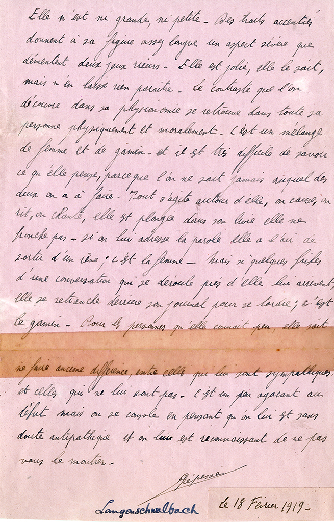 Item is a handwritten riddle describing Katharine McLennan that was written by Repesse during her time in Langenschwalbach, Germany. The item is written in French.