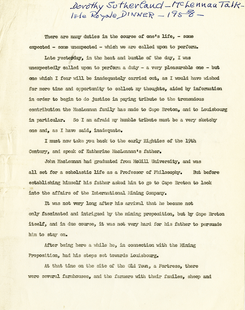 Item is reproduction of a speech given by Mrs. Dorothy Sutherland at a tribute dinner to the McLennan family that was held at the Isle Royale Hotel, Sydney, on July 26, 1958. The event was held in connection with the Louisbourg Bicentennial Celebrations. The speech focuses on the great efforts of J.S. McLennan and Katharine's work at Louisbourg.