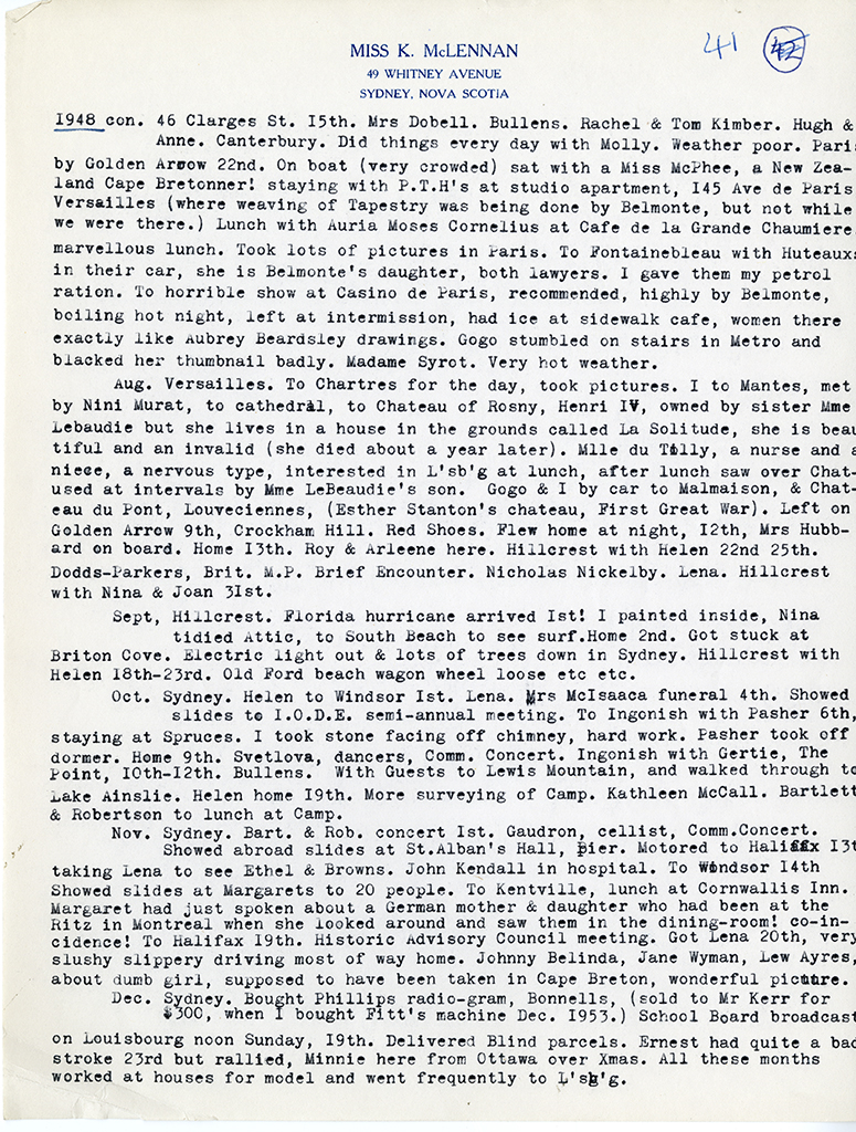 Item is a typed partial-transcription of Katharine McLennan's diaries from 1909-1952. Entries focus on important moments in Katharine's life, including her time spent in Europe as a girl and young adult, her trip west by car in 1927, and her work for both the Red Cross blood donor clinic and the Louisbourg Museum. The diary entries demonstrate how full and active her life was, and how involved she was in her community projects. The original copies of the diaries were burned by Katharine after she made these transcriptions.
