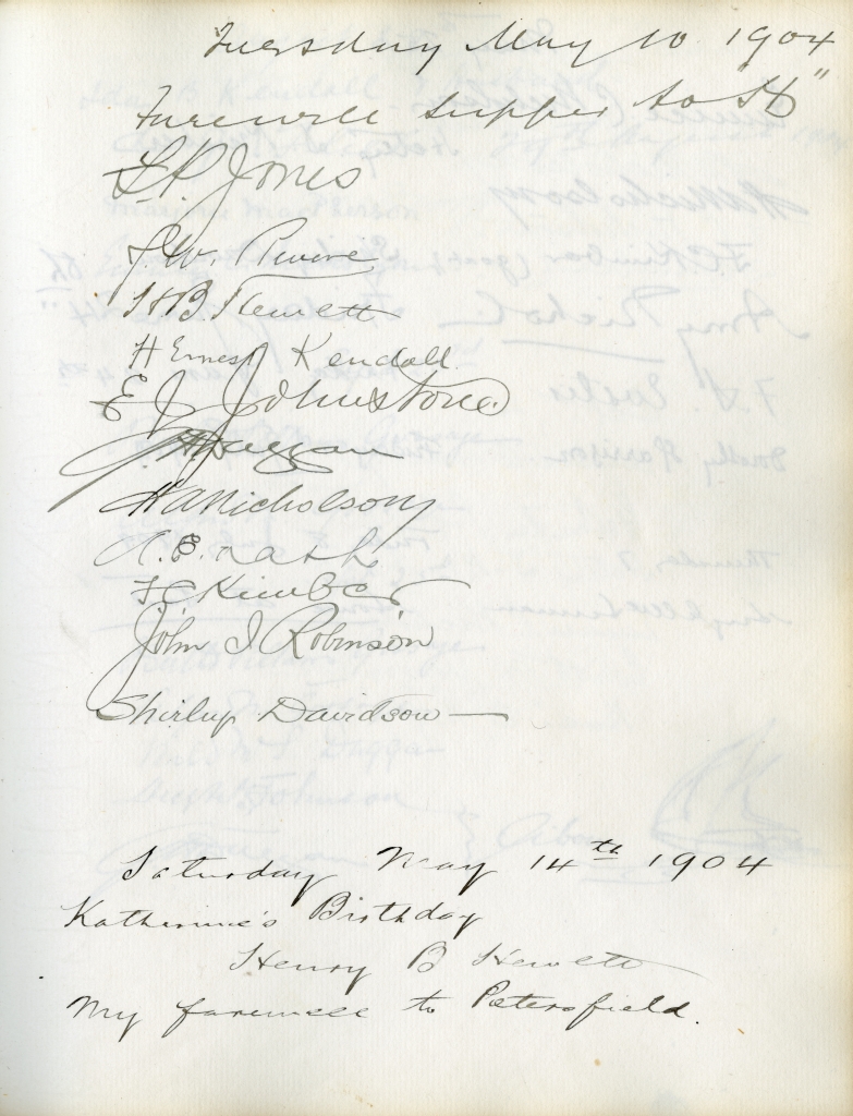 Item is the guestbook that was used at the Petersfield Estate, and later by Katharine at events on her home on Whitney Avenue, Sydney. In fact, Petersfield is most famous and historically interesting because of the guests who stayed there. Besides frequent local visitors like Hetty Kimber and her brother Fred, Shirley Davidson, the Burchells, the Sutherlands, the Grosvenors and visiting family members, the estate boasted visitors of international renown.