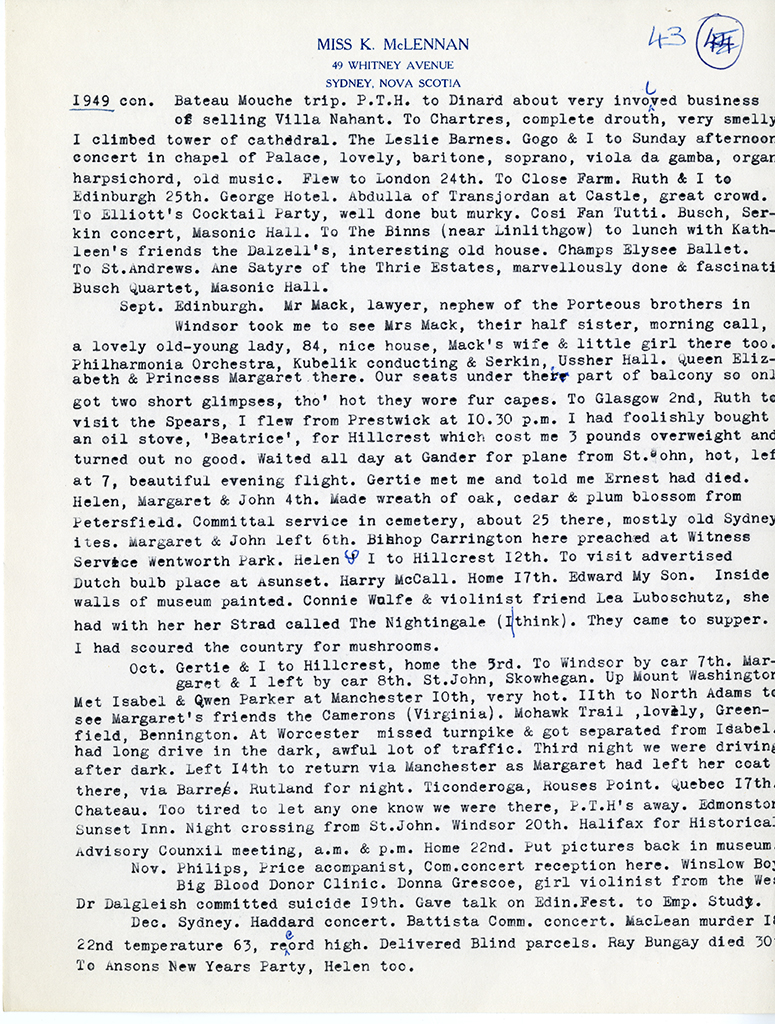 Item is a typed partial-transcription of Katharine McLennan's diaries from 1909-1952. Entries focus on important moments in Katharine's life, including her time spent in Europe as a girl and young adult, her trip west by car in 1927, and her work for both the Red Cross blood donor clinic and the Louisbourg Museum. The diary entries demonstrate how full and active her life was, and how involved she was in her community projects. The original copies of the diaries were burned by Katharine after she made these transcriptions.