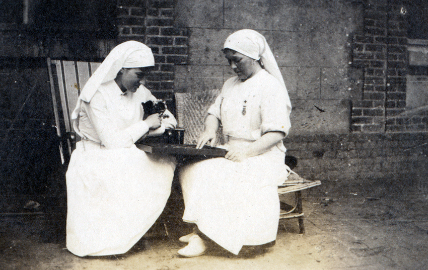 Item is a photograph of Katharine McLennan playing checkers with Mme. Heutte during their time at the Hôpital Auxiliare in Pont-Audemer, France.