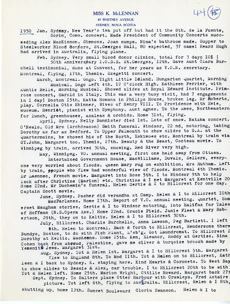 Item is a typed partial-transcription of Katharine McLennan's diaries from 1909-1952. Entries focus on important moments in Katharine's life, including her time spent in Europe as a girl and young adult, her trip west by car in 1927, and her work for both the Red Cross blood donor clinic and the Louisbourg Museum. The diary entries demonstrate how full and active her life was, and how involved she was in her community projects. The original copies of the diaries were burned by Katharine after she made these transcriptions.