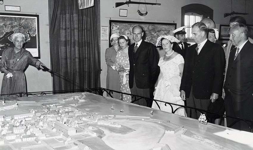 Item is a photograph of a Louisbourg Bicentennial event held at the Louisbourg Museum on July 26, 1958. Several individuals are identified, from left to right: Katharine McLennan, Mrs. Cross, U.K. Trade Commissioner's wife, Premier Stanfield, Mrs. Manson, Lt. Gov. Plow, Ida Burchell, C.J. Burchell. The photograph was taken by Abbass Studios.