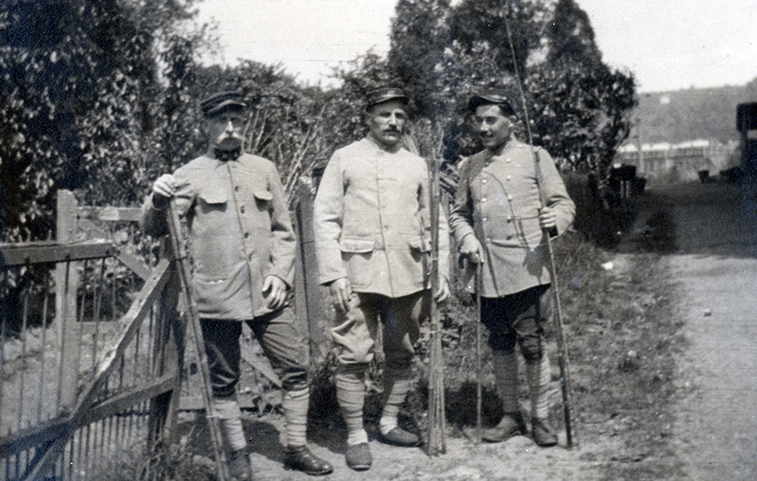 Item is a photograph of French soldiers Cornet, Leroi, and an unknown soldier which was taken during their time at the Hôpital Auxiliaire in Pont-Audemer, France. Katharine McLennan took a series of portraits of the men whom she served and cared for during her time as a volunteer nurse in WWI.