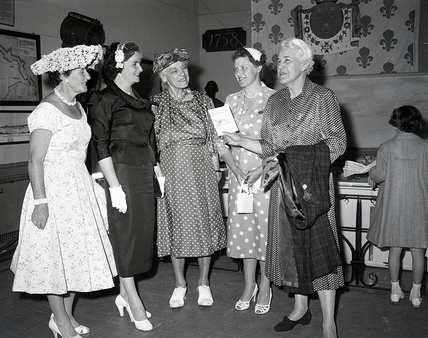 Item is a photograph of an event held at the Louisbourg Museum during the celebrations for the 1958 Louisbourg Bicentenary. Katharine McLennan is pictured on the far right, standing in front of the Louisbourg model that she built.