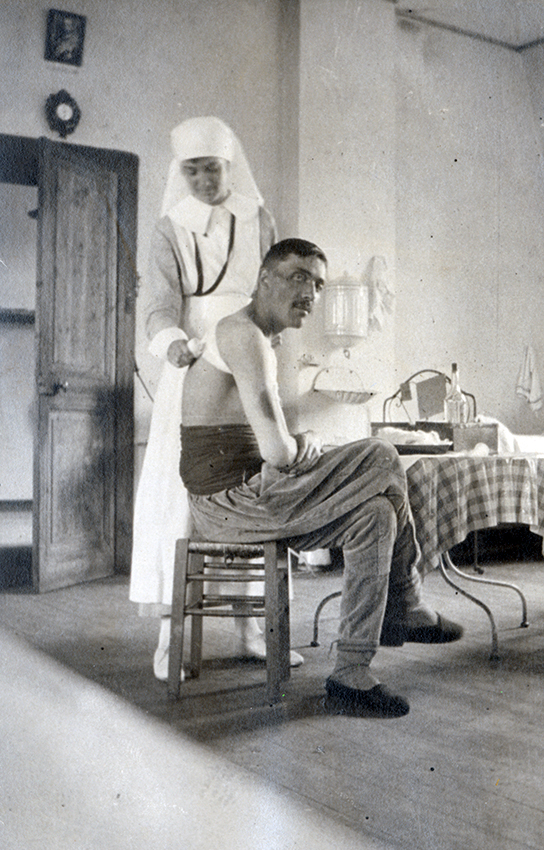 Item is a photograph of nurse Edith Parkman wrapping a dressing around patient Chauvin at the Hôpital Auxiliaire in Pont-Audemer, France, during WWI. The image is part of a series that was captured by Katharine McLennan of her fellow nurses taking care of their patients.
