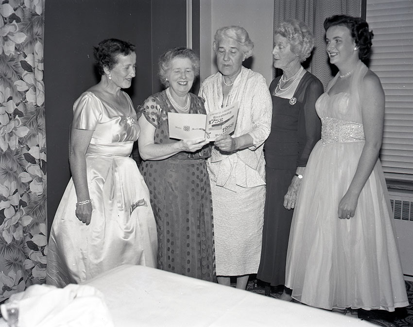 Item is a photograph of an event held at the Louisbourg Museum during the celebrations for the 1958 Louisbourg Bicentenary. Katharine McLennan is standing in the center, holding the programme of events for the festivities.