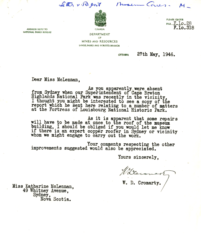 Item is a letter from W.D. Cromarty, National Parks Bureau, to Katharine McLennan which accompanied the attached report from the Superintendent of Cape Breton Highlands National Park, J. Smart. His report gives some suggestions to improvements that could be made in the Historic Park.