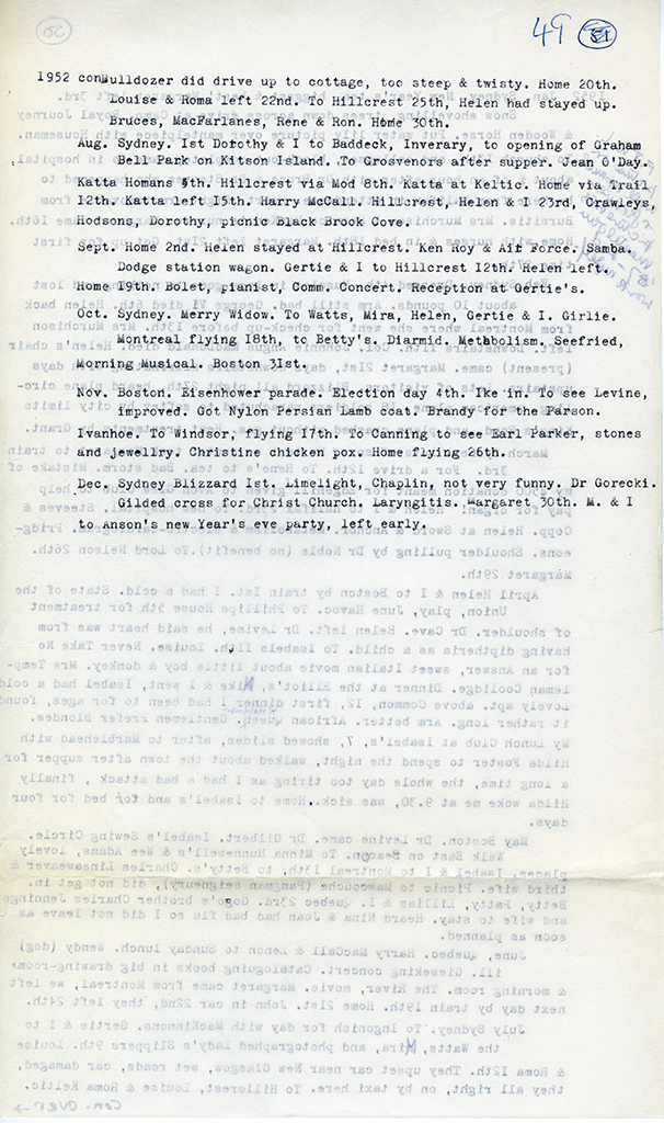 Item is a typed partial-transcription of Katharine McLennan's diaries from 1909-1952. Entries focus on important moments in Katharine's life, including her time spent in Europe as a girl and young adult, her trip west by car in 1927, and her work for both the Red Cross blood donor clinic and the Louisbourg Museum. The diary entries demonstrate how full and active her life was, and how involved she was in her community projects. The original copies of the diaries were burned by Katharine after she made these transcriptions.