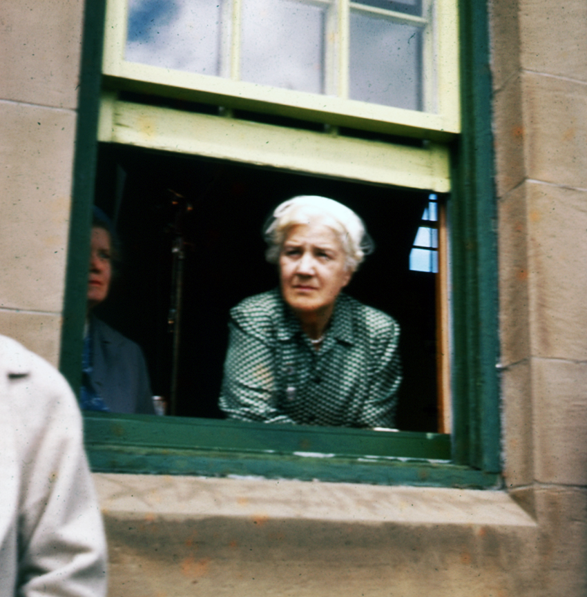 Item is a photograph of Katharine McLennan taken at the Museum during a Louisbourg Bicentennial event. She is looking out through a window of the Museum.