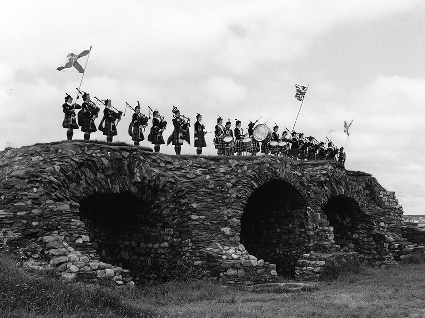 Item is a photograph of a pipe and drum band performing atop the casements inside the King's Bastion at the Fortress of Louisbourg to celebrate the Bicentennial anniversary of the end of the second siege on the Fortress.