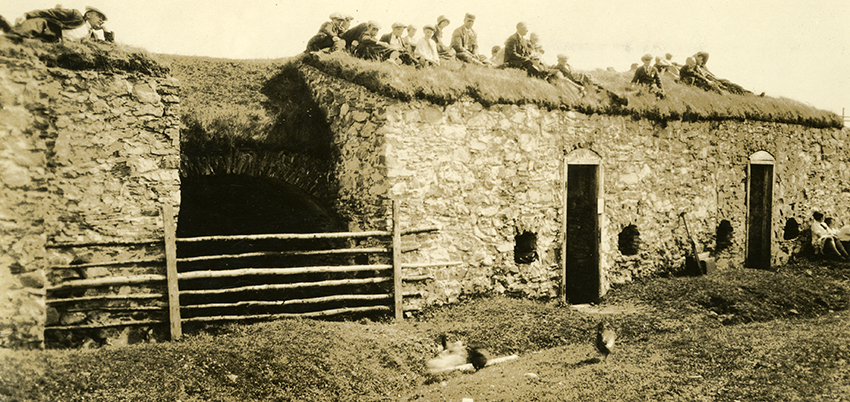 Item is a photograph of visitors sitting on the rooftop of a partially reconstructed building at the Fortress of Louisbourg site.
