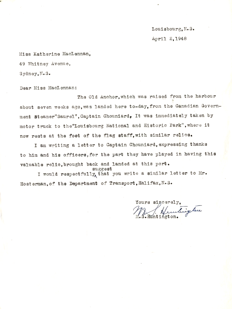 Item is a letter from M.S. Huntington to Katharine McLennan indicating that the anchor that had been recovered by the C.G.S. Saurel had been delivered to the Fortress of Louisbourg National Historic Park.