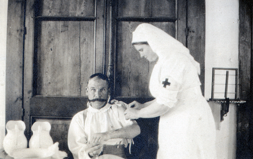 Item is a photograph of nurse Griffin wrapping a dressing around a patient at the Hôpital Auxiliaire in Pont-Audemer, France, during WWI. The image is part of a series that was captured by Katharine McLennan of her fellow nurses taking care of their patients.