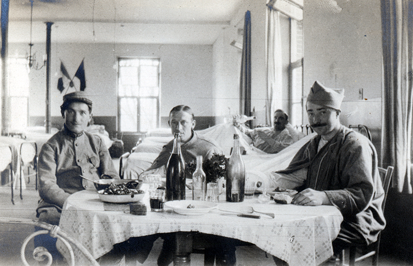 Item is a photograph of patients Laborde, Gardinal and Border enjoying supper in Salle Alber in the Hôpital Auxiliaire in Pont-Audemer, France, during WWI.