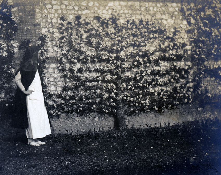 Item is a photograph of WWI nurse Edith Parkman posing beside an exterior wall with a decorative tree adhered to it. Katharine and her friends, including Edith, would frequently explore the French countryside when they were off duty.