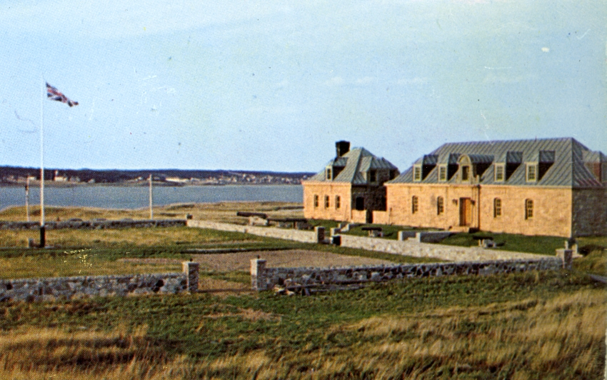 Item is a photograph of the Louisbourg Museum with the ocean visible in the background.